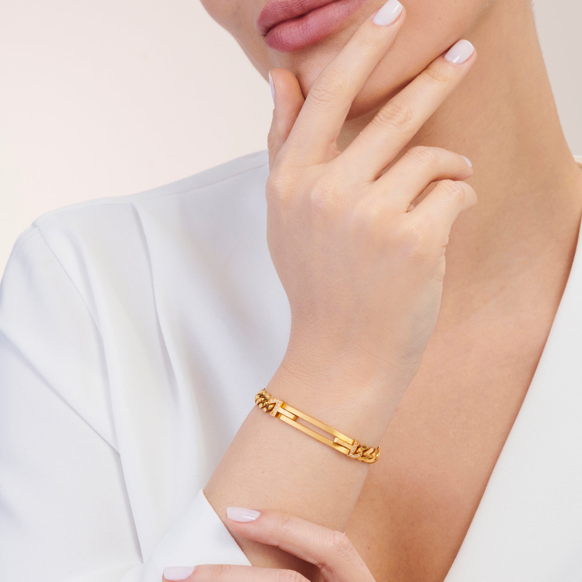 Introducing Altınbaş Jewelry's 22K Gold Bracelet, a piece that embodies the epitome of luxury and wealth. This stunning piece is meticulously crafted from the finest 22K Gold, a testament to our commitment to quality and sophistication. The color of the bracelet is a vibrant yellow, a hue that exudes warmth and elegance, perfect for a woman who appreciates the finer things in life. The bracelet features an array of dazzling cubic zirconia stones, each cut and set with precision. The round shape of these stones adds a timeless appeal to the piece, making it a versatile accessory that complements any outfit. This bracelet is not just a piece of jewelry, it's an expression of style and class. The design of the bracelet captures the endless circle of fashion. It is a piece that transcends trends and seasons, making it a valuable addition to any jewelry collection. The bracelet is a perfect blend of traditional craftsmanship and modern design, reflecting the aesthetic sensibilities of the contemporary woman. This 22K Gold Bracelet is designed for the woman who understands the value of luxury and appreciates the beauty of finely crafted jewelry. It is more than just an accessory, it is a statement of style, sophistication, and wealth. The bracelet is a perfect gift for yourself or a loved one, a piece that will be treasured for years to come. Experience the luxury of Altınbaş Jewelry with this 22K Gold Bracelet, a piece that embodies the endless circle of fashion and the epitome of wealth.