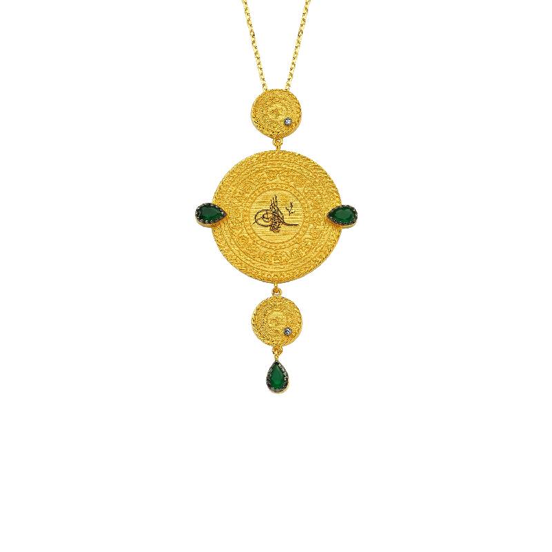 Indulge in the luxurious allure of the 22K Tugra Gold Necklace from Altınbaş Jewelry, a brand synonymous with sophistication and quality. Crafted with remarkable skill and precision, this necklace is a testament to our commitment to excellence and the embodiment of our promise to deliver only the best. This exquisite piece is fashioned from 22K gold, a material renowned for its durability and timeless appeal. Its radiant yellow hue is sure to draw attention and admiration, making it a perfect centerpiece for any outfit. The necklace is adorned with pear-shaped cubic zirconia stones in a vibrant shade of green, adding a touch of color and sparkle that is sure to captivate. The Tugra motif, a unique and elegant design element, lends an air of regality and sophistication to the piece. This intricately designed pattern is more than just a visual treat - it symbolizes the purity of the heart, making this necklace not just a piece of jewelry, but a meaningful expression of inner beauty and integrity. The 22K Tugra Gold Necklace is also an ode to your colorful dreams. The vibrant green stones represent your aspirations and ambitions, reminding you to always reach for the stars. This necklace is not just a piece of jewelry, it's a celebration of your dreams and the colorful journey towards achieving them. Perfect for the modern woman who appreciates the blend of tradition and contemporary design, this necklace is a versatile addition to any jewelry collection. Whether you're dressing up for a special occasion or adding a touch of elegance to your everyday look, this necklace is sure to make a statement. Experience the allure of the 22K Tugra Gold Necklace from Altınbaş Jewelry - a piece that speaks volumes about your taste, personality, and aspirations.