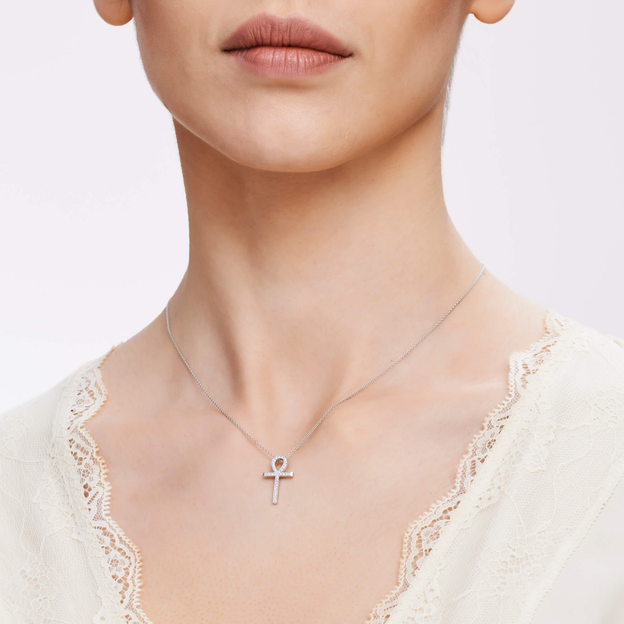 Introducing the Ankh Diamond Necklace from Altınbaş Jewelry, a perfect manifestation of pure luxury. This exquisite piece is meticulously crafted from 8K white gold, offering a lustrous appeal that will undoubtedly capture the attention of every onlooker. The necklace's design is a tribute to your refined taste, blending the perfect symmetry of traditional and modern aesthetics. The centerpiece of this necklace is the Ankh symbol, an ancient emblem of life, beautifully adorned with round-cut diamonds of the highest quality. These diamonds are meticulously arranged to enhance the overall elegance of the necklace, making it a symbol of eternal elegance. The G grade diamonds reflect light beautifully, adding a sparkling touch to the piece that is impossible to ignore. The Ankh Diamond Necklace is a confluence of tradition and modernity, making it an ideal accessory for the woman who values both. Its timeless design, coupled with the modern touch of white gold and diamonds, makes it a versatile piece that can complement any outfit, from a casual day look to a glamorous evening ensemble. This necklace is more than just a piece of jewelry; it's a statement of sophistication and quality that Altınbaş Jewelry is known for. It is designed for the woman who appreciates the finer things in life and isn't afraid to showcase her unique style. So, why wait? Elevate your jewelry collection with the Ankh Diamond Necklace, a piece that perfectly embodies your elegance and refined taste.