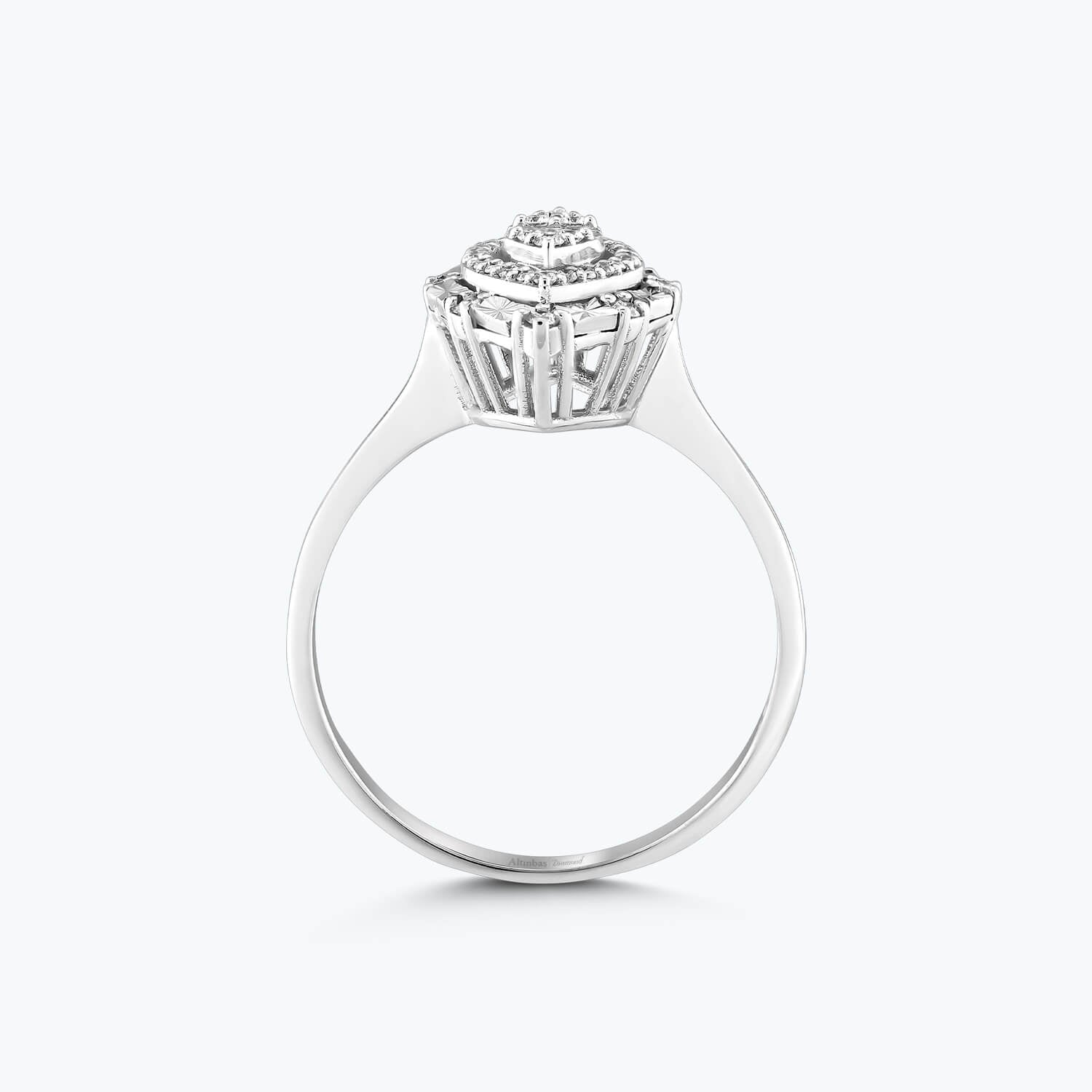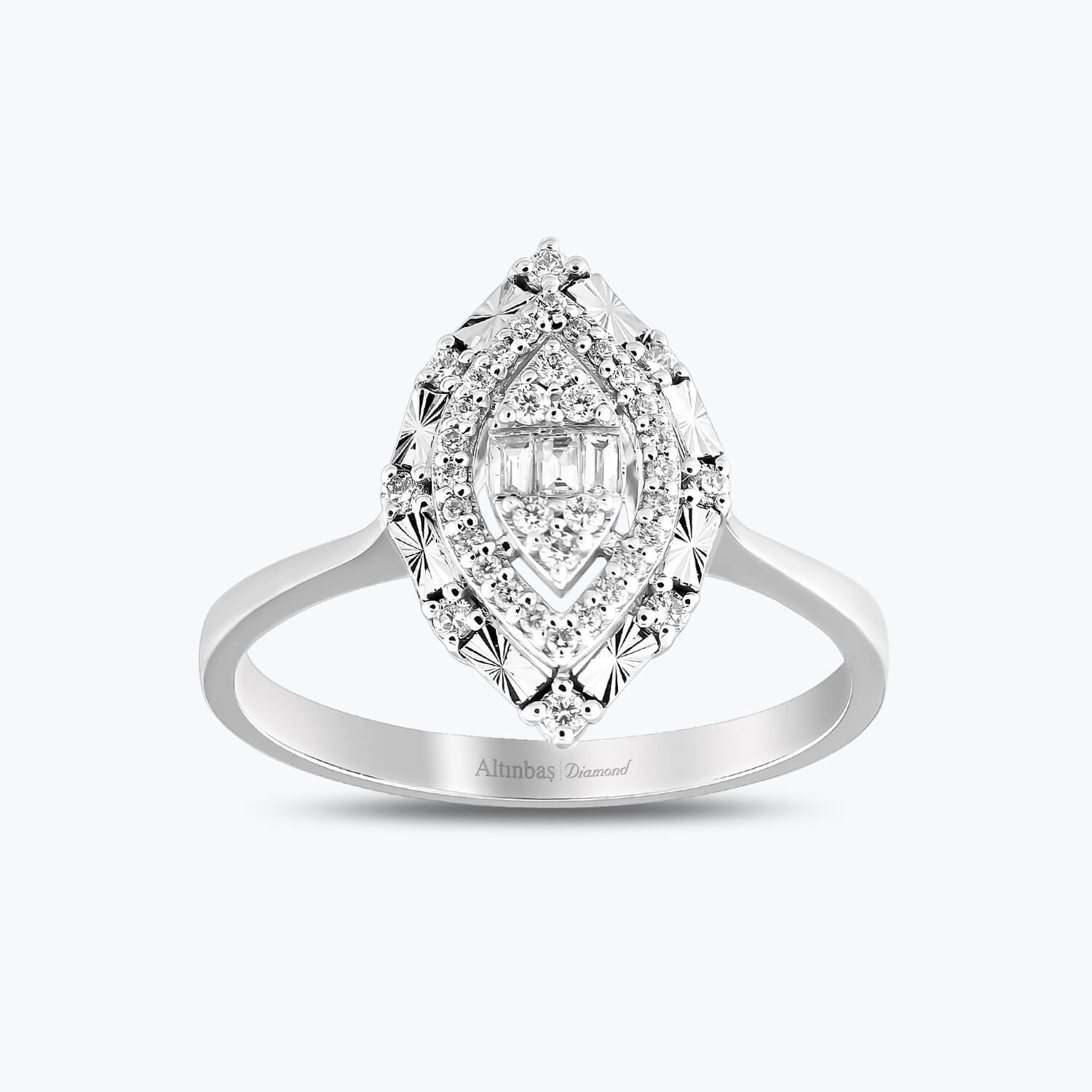 Immerse yourself in the lustrous beauty of Altınbaş Jewelry's Baguette Diamond Ring. This exquisite piece is masterfully crafted from 14K white gold, a material known for its lasting shine and durability. The radiant round diamond at the center of this ring is surrounded by a halo of smaller diamonds, creating an effect of infinite sparkle that never fades. Each diamond is meticulously selected for its brilliance and clarity, embodying the sophistication and quality Altınbaş Jewelry is renowned for. The baguette cut of these diamonds further enhances their radiance, making this ring a true symbol of infinite love. The white gold band of this ring is adorned with a series of baguette diamonds, adding to the overall richness of the design. This continuous embrace of sophistication makes the ring not just a piece of jewelry, but a statement of class and elegance. Designed for women who appreciate the finer things in life, this ring is more than just an engagement ring. It's a testament to the love and commitment that binds two souls together. It's a gift to be cherished forever, a constant reminder of the special bond you share. Whether you're planning a proposal, celebrating a milestone, or simply want to express your love, this Baguette Diamond Ring from Altınbaş Jewelry is the perfect choice. Its timeless design and unparalleled craftsmanship depict richness and class, making it a piece to be treasured for generations. With this ring on your finger, every day is a celebration of love, elegance, and the beauty of eternal commitment.