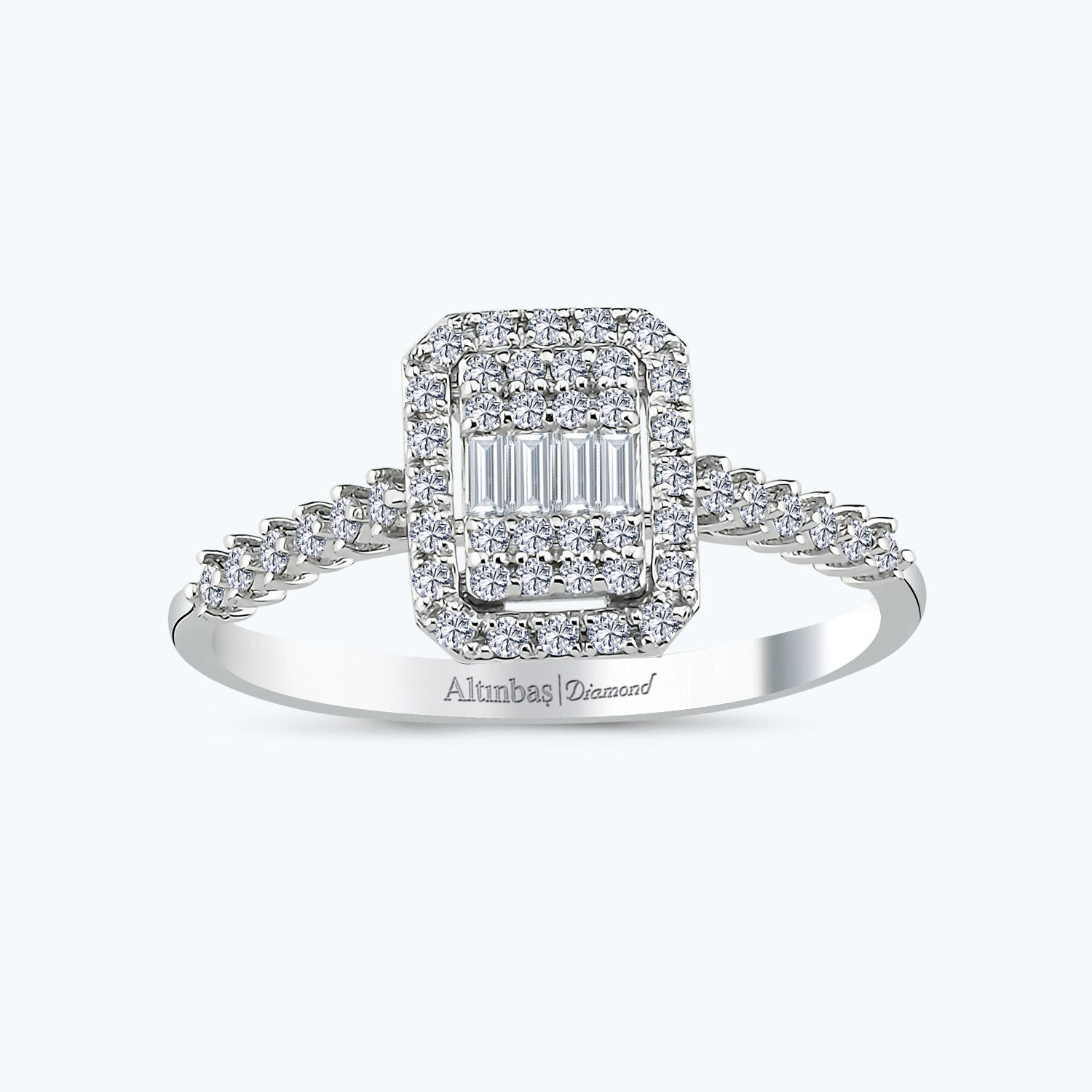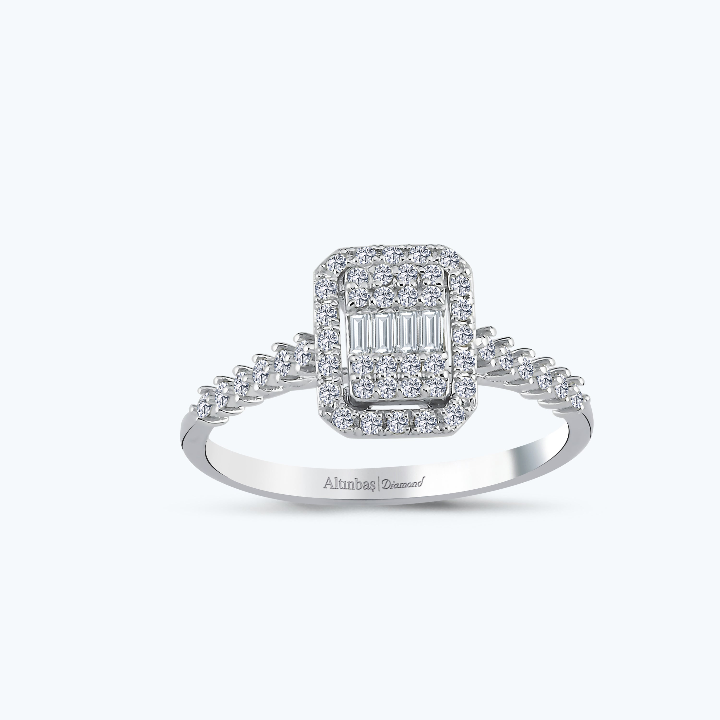 Introducing Altınbaş Jewelry's Baguette Diamond Ring, a true testament to the power of making a promise. This stunning piece is not just an engagement ring; it is an emblem of love and devotion, a symbol that never fades, just like your love. Crafted with meticulous attention to detail, this ring is a testament to the enduring beauty and sophistication synonymous with our brand. The centerpiece of this ring is the baguette diamond, a gemstone renowned for its unique, elongated shape that exudes a vintage charm. This diamond is set in 14K white gold, a metal revered for its timeless elegance and durability. The white gold setting not only enhances the brilliance of the diamond but also unveils the beauty of gold in a unique and contemporary way. Our Baguette Diamond Ring features a halo setting, where smaller diamonds encircle the central baguette diamond. This design element not only adds to the ring's brilliance but also creates an illusion of a larger central diamond, enhancing its visual impact. The ring also features side stones, offering an additional layer of sparkle that complements the central diamond. Each diamond used in this ring is of G color grade and SI clarity, ensuring a dazzling display of sparkle and fire. Designed with women in mind, this ring is a perfect blend of elegance and sophistication. It is a piece that can be cherished for a lifetime, a constant reminder of a promise made and the unfading love it represents. With this ring, you're not just giving a piece of jewelry; you're giving a symbol of your everlasting devotion.