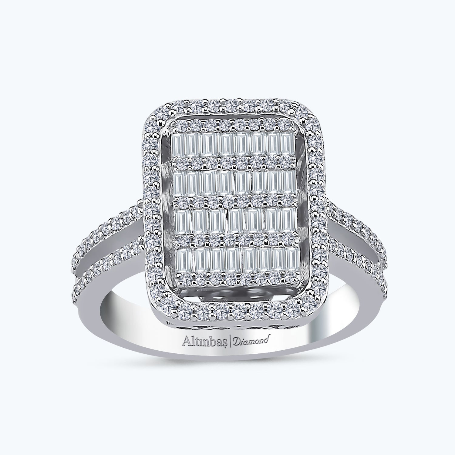 Introducing the Baguette Diamond Ring from Altınbaş Jewelry, a piece that embodies the captivating allure of gold and the timeless elegance of diamonds. Crafted with the utmost precision and attention to detail, this ring is a testament to our commitment to quality and sophistication. This luxurious ring is made from 14K white gold, a metal renowned for its durability and lustrous sheen. The white gold serves as a perfect backdrop for the glittering diamonds, enhancing their brilliance and making them the star of the show. The ring features a unique design with baguette-cut diamonds. Baguette diamonds are known for their elongated rectangular shape, which allows for a high level of clarity and a distinct, modern aesthetic. This modern design element is complemented by the addition of side stones, which add a touch of traditional elegance and amplify the overall sparkle of the ring. This Baguette Diamond Ring is not just a piece of jewelry, but a symbol of timeless elegance. It's a statement piece, a conversation starter, and a testament to your exquisite taste. It's the perfect accessory for any woman who appreciates the finer things in life and wants to showcase her unique style. Whether you're treating yourself or surprising a special someone, this ring is an investment in beauty, quality, and timeless style. It's a piece that will be cherished for generations, a testament to the captivating allure of gold and the timeless elegance of diamonds. Experience the luxury and sophistication of Altınbaş Jewelry with this stunning Baguette Diamond Ring. It's not just a ring, it's a symbol of elegance, a testament to quality, and a piece that will stand the test of time.