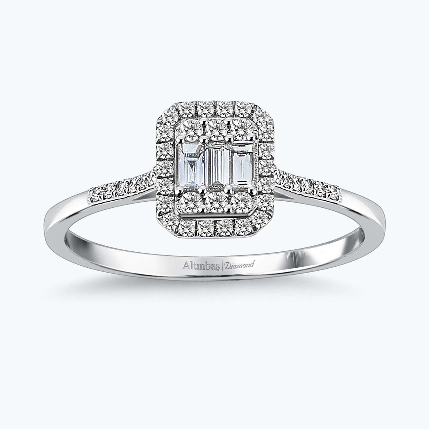 Introducing the Baguette Diamond Ring from Altınbaş Jewelry, a piece that exudes sophistication and quality in every facet. This ring is the perfect embodiment of exquisite craftsmanship, designed meticulously to celebrate the formation of a romantic bond. The centerpiece of this ring is a stunning baguette diamond, known for its elongated, rectangular cut that enhances the diamond's clarity and brilliance. The diamond is set in a beautiful white setting, creating a striking contrast that draws attention to the stone's radiance. The Baguette Diamond Ring is not just a piece of jewelry; it's a symbol of love, commitment, and a promise of forever. It is the perfect engagement ring, a token of love that speaks volumes about the depth of your feelings. Every detail of this ring reflects Altınbaş's commitment to quality and sophistication. The diamond is expertly cut and set, ensuring that it sparkles from every angle. The white setting is meticulously crafted, adding a touch of elegance to the overall design. The Baguette Diamond Ring is more than just a ring; it's a statement of love, a testament to a bond that's as strong and enduring as the diamond itself. It is a piece that will be cherished for a lifetime, a constant reminder of a love story that's as unique and precious as the diamond it holds. Altınbaş Jewelry, with its commitment to luxury and sophistication, offers you this exquisite piece that is bound to leave a lasting impression. With this ring, you're not just giving a gift; you're making a promise, a promise of a love that's as timeless and beautiful as the diamond itself.