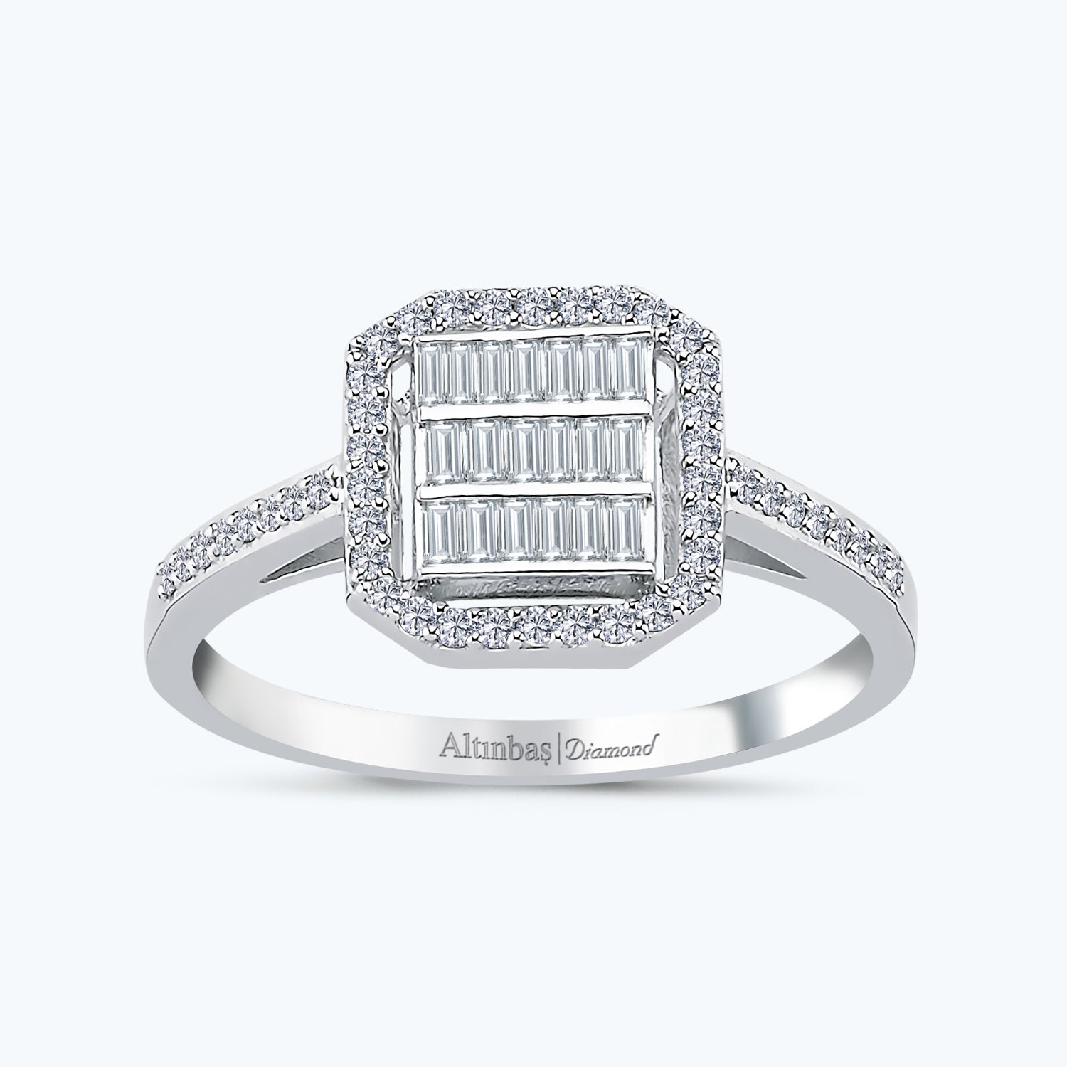 Introducing the Baguette Diamond Ring from Altınbaş Jewelry, an embodiment of sophistication and quality. This stunning piece is more than just an accessory; it's a treasure of exquisite beauty that perfectly complements the most important step of your life. Expertly crafted from 14K white gold, this ring is designed to reflect the brilliance of the sun, adding an elegant sparkle to your everyday style. The centerpiece of this ring is the baguette diamond, a gem known for its unique rectangular shape and step-like facets. This diamond cut is renowned for its ability to reflect light in a way that highlights its clarity, creating a dazzling display of sparkle and shine. The baguette diamond is flanked by side stones, enhancing the ring's radiance and adding to its overall allure. Designed for women who appreciate the finer things in life, this engagement ring is more than a piece of jewelry. It's an eternal symbol of love and commitment, designed to be as enduring as your love story. The 14K white gold setting offers a timeless appeal, while the diamonds add a touch of modern elegance. This combination creates a ring that is both classic and contemporary, making it a perfect choice for today's bride. Whether you're planning a proposal or looking to celebrate a significant milestone, the Baguette Diamond Ring from Altınbaş Jewelry is the perfect choice. Its radiant beauty, combined with its high-quality craftsmanship, makes it a piece that will be treasured for a lifetime. Choose this ring to express your love and commitment in the most beautiful way possible.