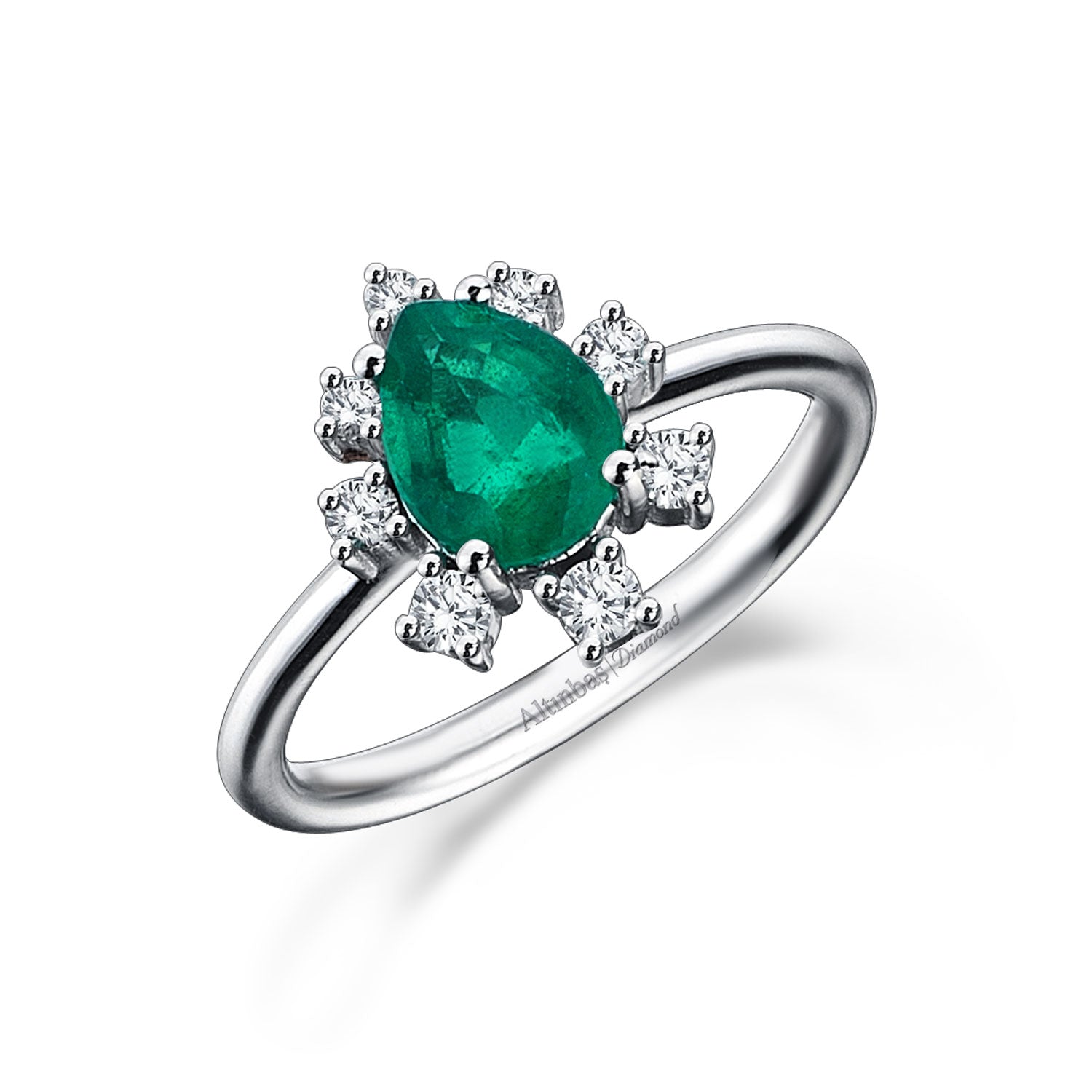 Introducing our luxurious Emerald Diamond Ring, a dreamy and magical piece from Altınbaş Jewelry. This stunning ring is a symbol of infinite love, designed to captivate and inspire with its timeless elegance. Crafted with meticulous attention to detail, this ring is a celebration of life's diversity and a true manifestation of sophistication. The ring is expertly fashioned from 14K white gold, a metal known for its durability and luminous shine. This choice of material not only ensures the longevity of the piece but also adds a touch of modern elegance to any ensemble. At the heart of this exquisite ring lies a dazzling pear-shaped emerald, a gemstone renowned for its vibrant and enduring color. This colored stone is a representation of purity and sanctity, making this ring not just a piece of jewelry but a meaningful token of love. Surrounding the emerald are brilliant diamonds, their sparkle enhancing the deep green of the emerald and adding an extra layer of luxury to the ring. These diamonds are carefully selected for their quality and brilliance, ensuring that the ring sparkles from every angle. This Emerald Diamond Ring is not just an accessory, it's a statement. It's an expression of timeless elegance, a testament to Altınbaş's commitment to quality and design. It's the perfect engagement ring for the woman who values sophistication and individuality. Whether it's a proposal, an anniversary, or a special gift, this ring is a perfect choice. It's more than just a ring, it's an unfading symbol of love, a piece of jewelry that will be cherished for a lifetime.