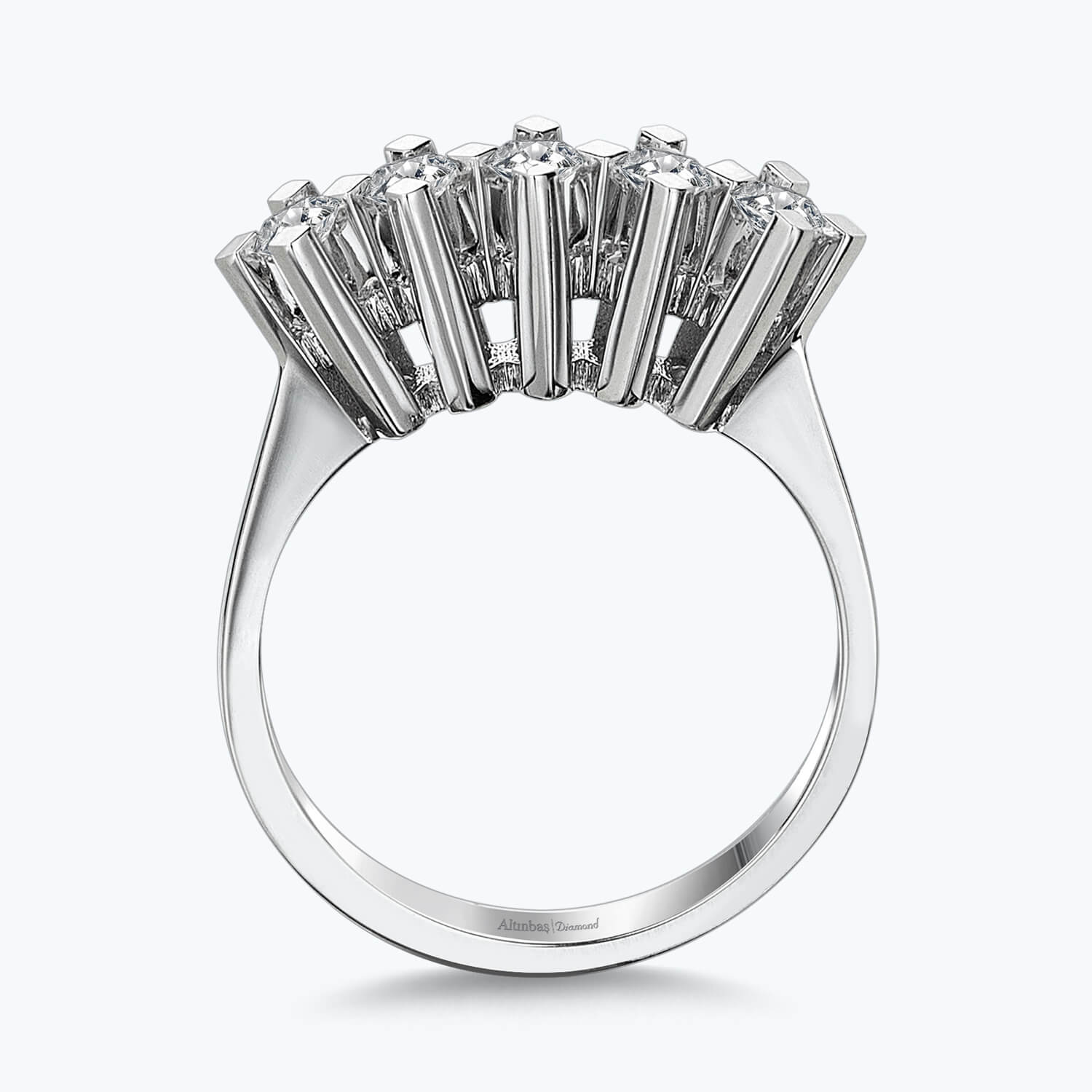 Introducing the Five Stone Diamond Ring, a timeless treasure of exquisite beauty from Altınbaş Jewelry. Expertly crafted from 14K white gold, this ring is not just a piece of jewelry, but a symbol of infinite charm and enduring love. It's a perfect choice for women who appreciate sophistication and quality in every detail. This ring features five stunning round diamonds, each carefully selected for its brilliance and sparkle. The diamonds are set in a row, representing the journey of love and commitment. This design celebrates your love that is meant to last forever, making it an ideal engagement ring or a special gift for an anniversary. The 14K white gold setting enhances the diamonds' radiance, creating a breathtaking display of light and sparkle. Gold, known for emanating the energy of the sun, brings a warm and radiant glow to this ring. The white gold setting offers a modern and elegant look that complements the brilliance of the diamonds. The Five Stone Diamond Ring is more than just a piece of jewelry; it's a testament to a love story that's as unique and radiant as the diamonds it holds. This ring is perfect for elevating everyday elegance or adding a touch of glamour to special occasions. With Altınbaş Jewelry, you're not just purchasing a ring; you're investing in a timeless piece that will be cherished for generations. Let this Five Stone Diamond Ring be the symbol of your love, as enduring and brilliant as the diamonds themselves.