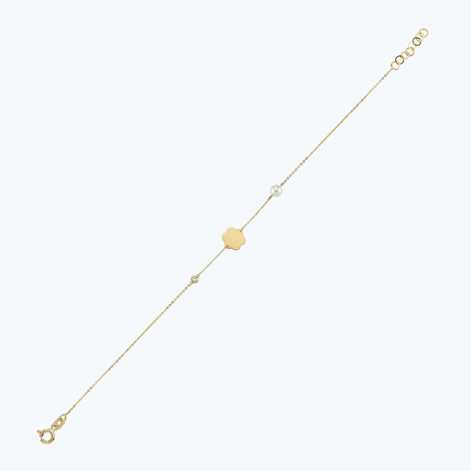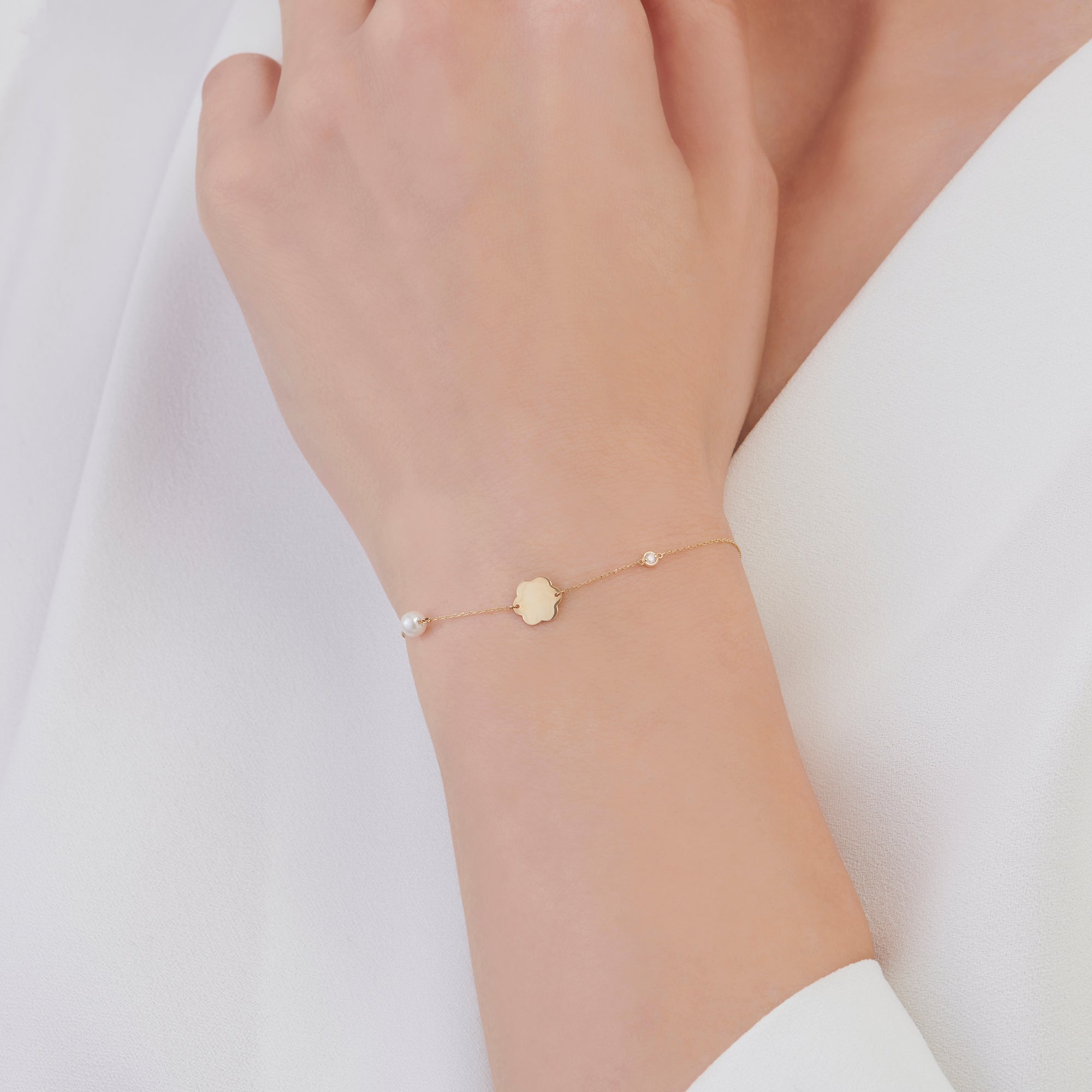 Introducing Altınbaş Jewelry's Flower Diamond Bracelet, a treasure of exquisite beauty that is meticulously crafted to captivate and charm. This bracelet is the epitome of luxury and wealth, designed to elevate your style and add an air of sophistication to any outfit. Every detail of this bracelet has been thoughtfully considered and beautifully executed. It is made from 14K yellow gold, a material renowned for its timeless appeal and durability. The gold's warm, lustrous hue complements the green and white diamonds, creating a stunning contrast that is both eye-catching and elegant. The bracelet features a series of round diamonds, carefully selected for their brilliance and sparkle. These diamonds are arranged in a floral pattern, adding a touch of femininity and grace to the design. Each diamond is set in a way that allows it to catch the light from every angle, creating a dazzling display of sparkle and shine. Adding to the allure of this bracelet is the inclusion of pearls, a classic gem that exudes sophistication and elegance. The pearls are beautifully matched in size and color, adding a touch of classic charm to the modern design. This Flower Diamond Bracelet is a piece that embodies the embrace of continuous sophistication. It's a piece that doesn't just accessorize, but announces your presence. It's a piece designed not just to be worn, but to be treasured. Ideal for the modern woman who appreciates the finer things in life, this bracelet is more than just a piece of jewelry. It's a statement of style, a symbol of elegance, and a treasure of exquisite beauty. With this bracelet, you're not just wearing a piece of jewelry, you're wearing a piece of art. Experience the luxury of Altınbaş Jewelry. Embrace the sophistication. Treasure the beauty.