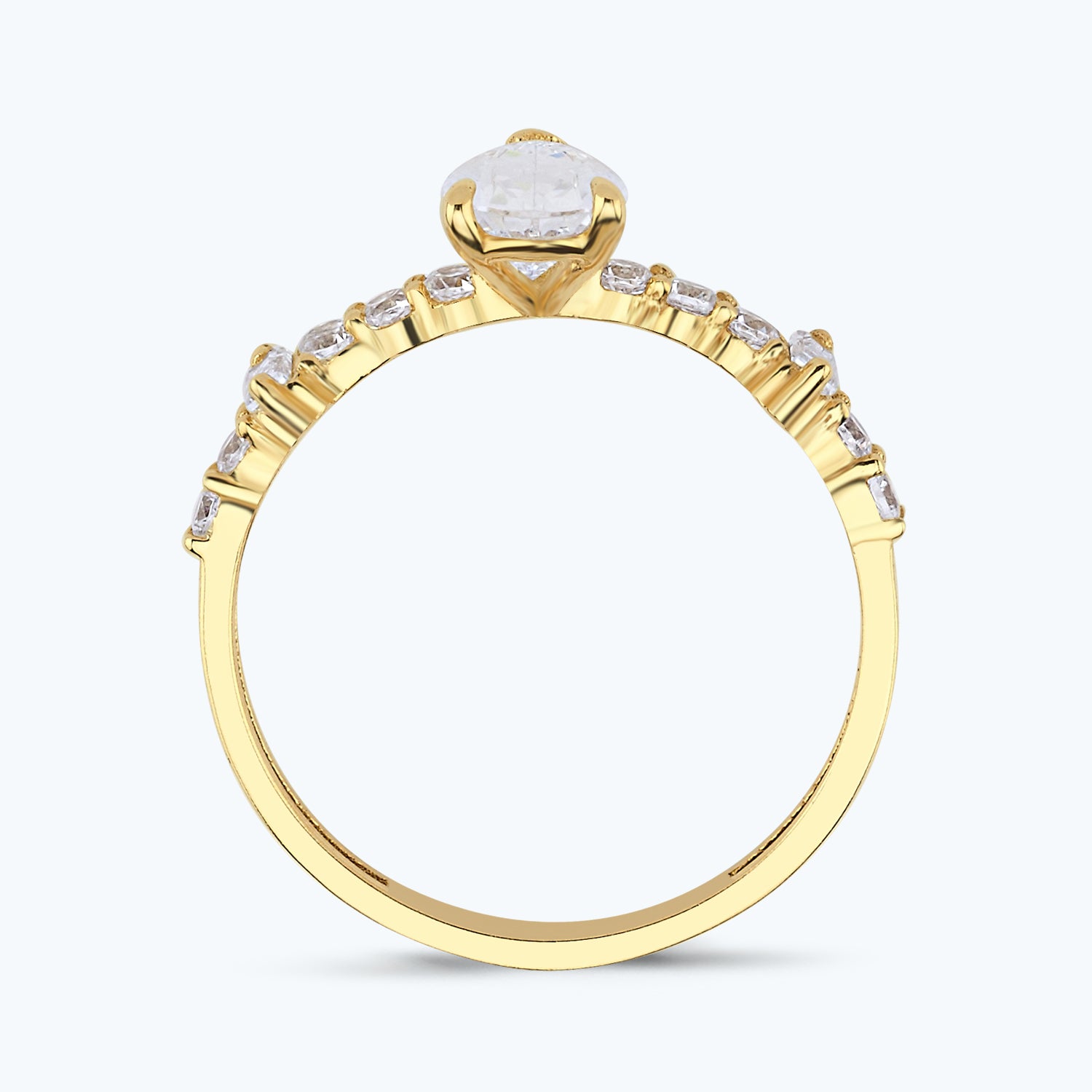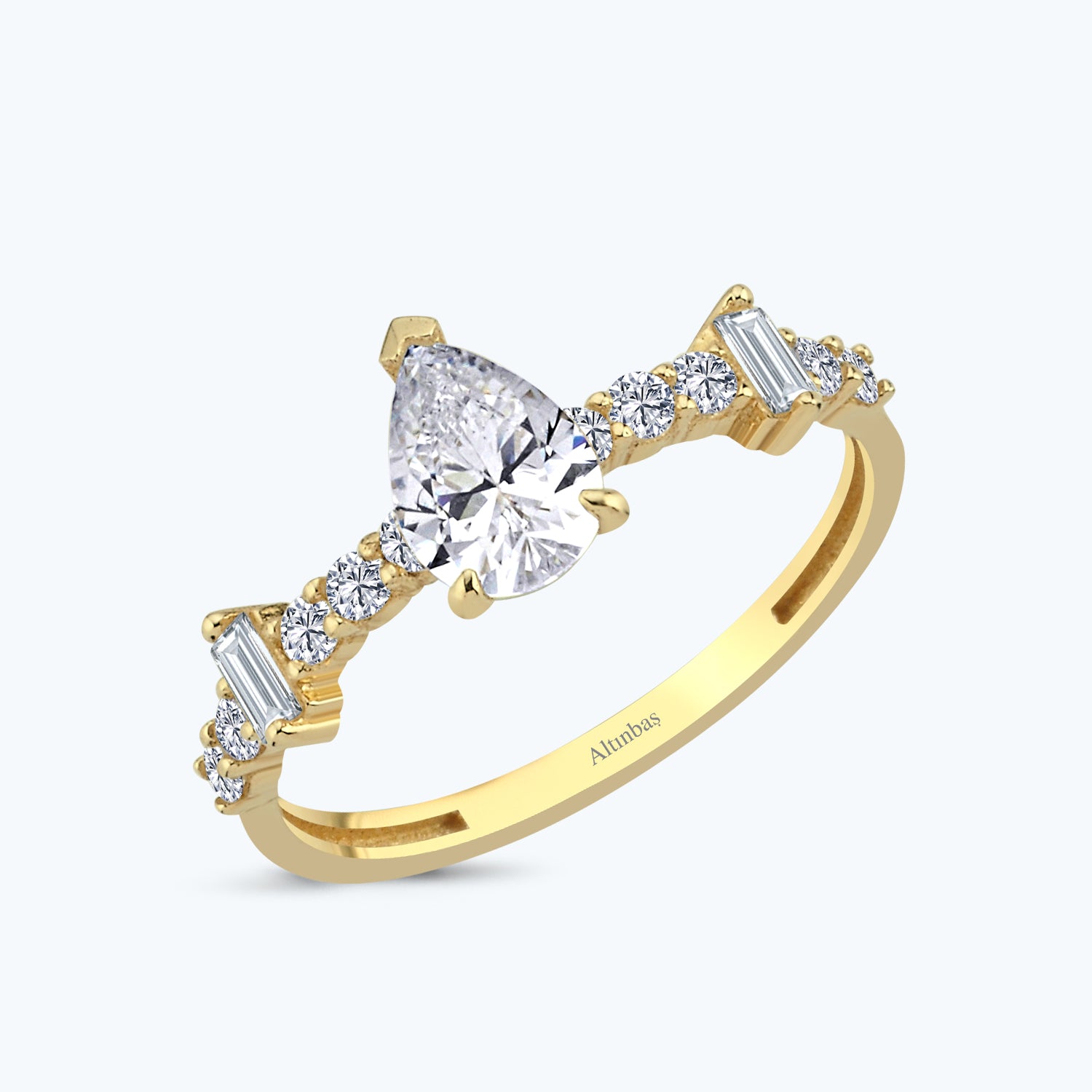Elevate your jewelry collection with this luxurious Gold Ring from Altınbaş Jewelry. Expertly crafted from 14K yellow gold, this exquisite piece is a testament to our commitment to sophistication and quality. Its radiance is sure to illuminate your hand, making it an eye-catching piece that speaks volumes about your elegant taste. The ring features a stunning pear-shaped cubic zirconia as its centerpiece. This dazzling gem is known for its brilliance and clarity, symbolizing the pure and passionate love you hold. It's surrounded by a series of baguette side stones, meticulously placed to enhance the ring's overall sparkle. The combination of these stones creates a stunning visual spectacle that is sure to attract admiration from every corner. This gold ring is not just a piece of jewelry; it's an expression of divine and royal power. The pear shape is often associated with royalty, making this ring a perfect choice for those who love to flaunt their regal style. The 14K yellow gold setting further enhances this royal vibe, adding a touch of timeless elegance to your look. Ideal for various occasions, this ring makes a perfect anniversary gift or engagement ring. Its radiant beauty and symbolic meaning make it a perfect choice to express your deep love and commitment. It's also a great gift for Mother's Day, allowing you to show your appreciation for the most important woman in your life. Whether you're buying it for yourself or as a gift, this Gold Ring from Altınbaş Jewelry is a piece that will be cherished for years to come. It's more than just a ring; it's a symbol of love, power, and elegance. Add it to your collection today, and let its beauty speak for itself.