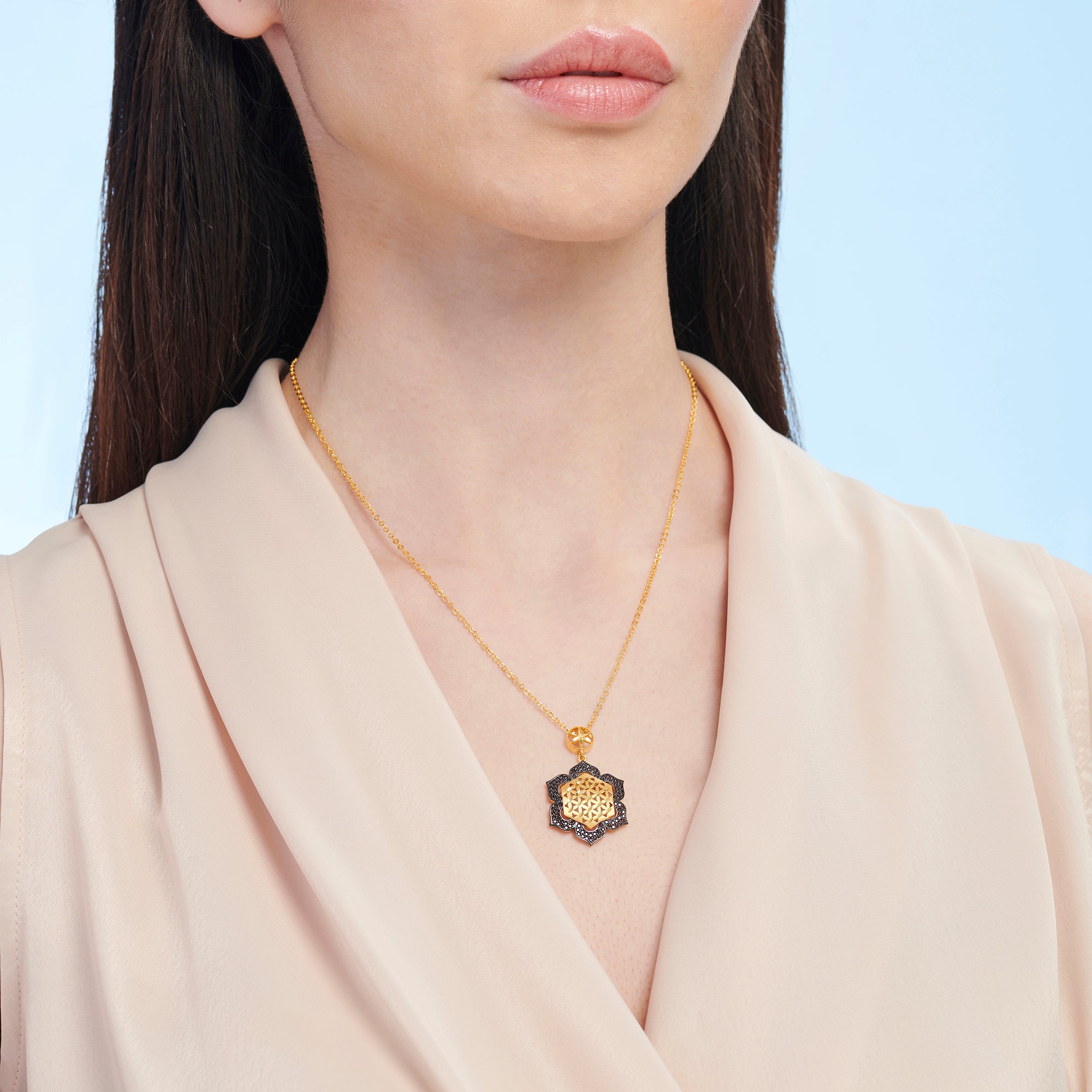 Experience the uninterrupted flow of grace with the 22K Flower of Life Gold Necklace by Altınbaş Jewelry. This exquisite piece is a testament to the timeless elegance and sophistication that our brand embodies. Crafted from high-quality 22K yellow gold, this necklace is the epitome of luxury and refinement. The centerpiece of this necklace is the striking Flower of Life pendant. This symbol, often associated with sacred geometry, is intricately designed to reflect the beauty and interconnectedness of all life. The pendant's intricate design is enhanced by the radiant glow of the yellow gold, creating a mesmerizing effect that is sure to captivate onlookers. Adding a touch of contrast to the warm hue of the gold is a series of black cubic zirconia stones. These stones are carefully set around the pendant, their dark sparkle providing a stunning contrast to the gleaming gold. The round cut of these stones further enhances their brilliance, making this necklace a truly dazzling piece. The 22K Flower of Life Gold Necklace is not just a piece of jewelry; it's a statement of style and sophistication. Its elegant design and high-quality materials make it a perfect accessory for those who appreciate the finer things in life. Whether worn for a special occasion or as a daily accessory, this necklace is sure to add a touch of luxury and elegance to any outfit. Experience the beauty and grace of the Flower of Life with this stunning gold necklace from Altınbaş Jewelry. It's more than just a piece of jewelry; it's a symbol of elegance and sophistication that you can wear close to your heart.