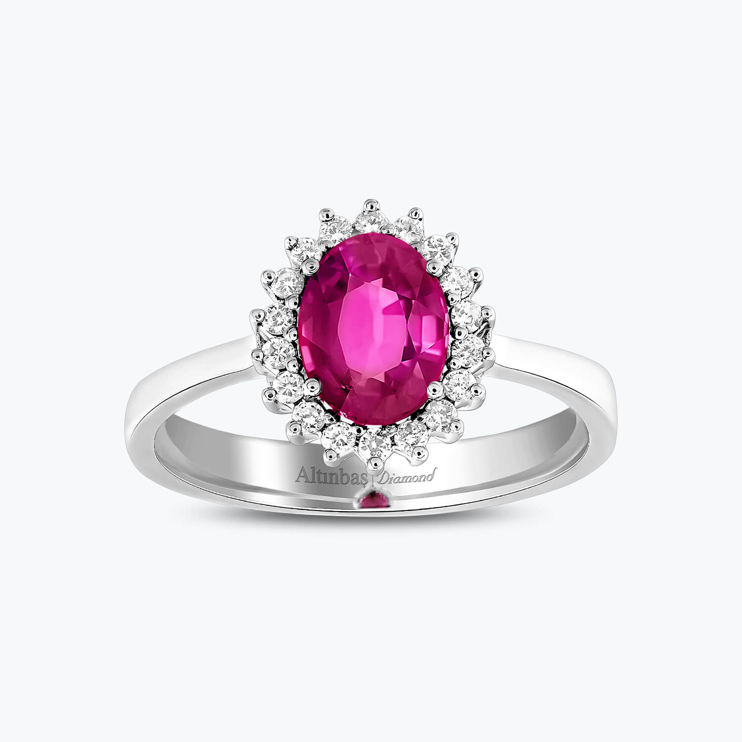 Experience the epitome of luxury and wealth with Altınbaş Jewelry's enchanting Ruby Diamond Ring. This exquisite piece is designed to elevate your everyday elegance, making it a perfect choice for women who appreciate sophistication and shine. Crafted from 14K white gold, this ring exudes a radiance that captures hearts. The gold setting provides a stunning contrast to the colored gemstone, enhancing its vibrant hue and amplifying its natural beauty. This ring is not just a piece of jewelry, but an artistic expression of sophistication, designed to complement your unique individuality. At the heart of this ring is an oval ruby, a treasure of exquisite beauty. This gemstone is revered for its deep red color and is often associated with passion, making it an ideal symbol for the moment when two hearts unite. The ruby is set in a halo of round diamonds, adding an extra layer of sparkle and drawing attention to the ruby's radiant color. The ring's design is a representation of wholeness and completion, with the ruby and diamonds perfectly complementing each other. The halo setting not only enhances the ruby's brilliance but also creates an illusion of a larger gemstone, offering a grandeur that's hard to resist. Whether it's for an engagement or a special occasion, this Ruby Diamond Ring from Altınbaş Jewelry is a perfect choice. Its sophisticated design and radiant sparkle make it a timeless piece that will be cherished for generations.