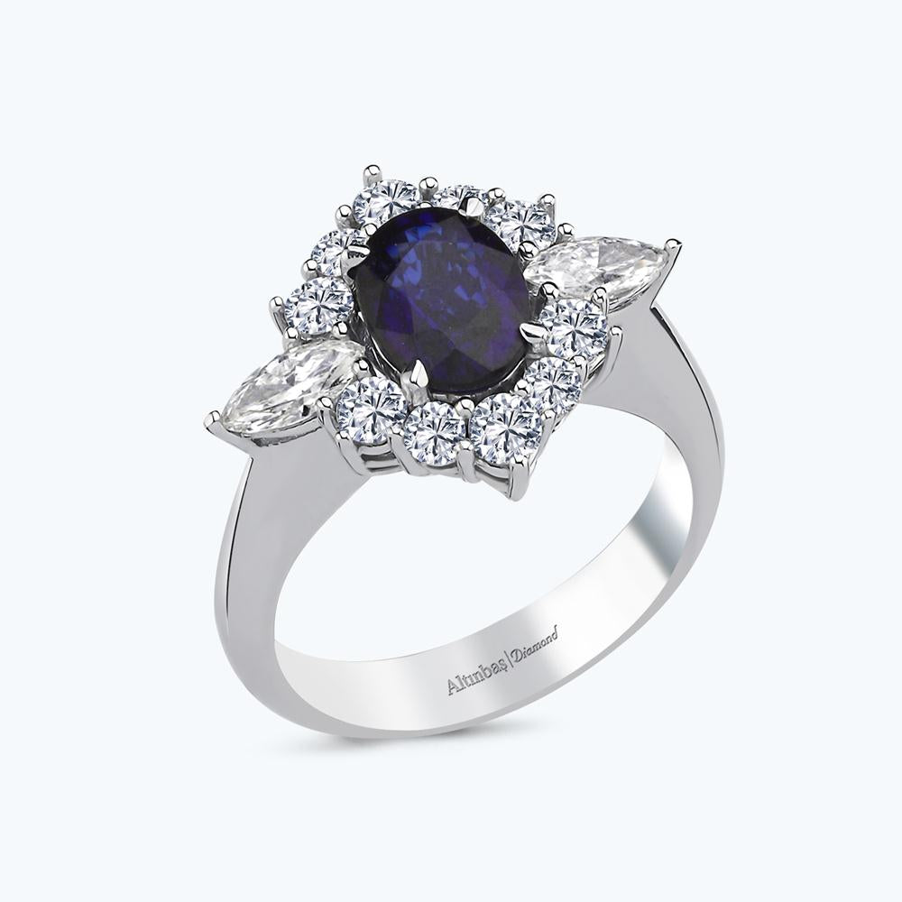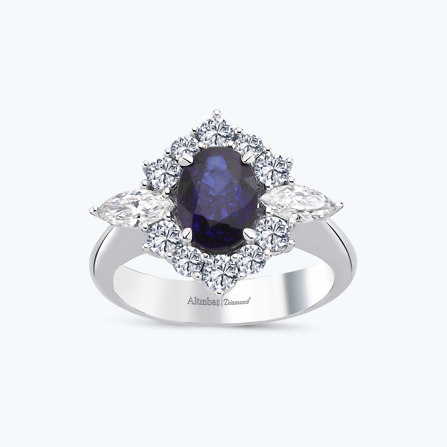 Introducing the Sapphire Diamond Ring from Altınbaş Jewelry, a piece that is as striking and showy as it is special. This ring is not just a piece of jewelry, but a symbol of the formation of a romantic bond, a testament to love that is as enduring as the precious stones it is crafted from. Crafted from 14K white gold, this ring is a perfect balance of style and elegance. The white gold setting provides a gleaming backdrop for the gemstones, enhancing their natural beauty and brilliance. This precious metal is not just about aesthetics, it also offers durability and strength, making it perfect for an engagement ring that is meant to last a lifetime. At the heart of this ring lies a stunning oval sapphire. This gemstone, with its deep blue hue, is not only visually captivating but also represents purity and sanctity. It is surrounded by a halo of sparkling diamonds that add to its allure, creating a mesmerizing effect that is sure to turn heads. The diamonds, carefully selected and meticulously placed, elevate everyday elegance to a whole new level. They add a touch of luxury and sophistication, making this ring a true statement piece. This Sapphire Diamond Ring is not just a piece of jewelry, it's a symbol of love, commitment, and a promise of a future together. It's a piece that's designed to be cherished, just like the love it represents. Whether you're planning a proposal, celebrating an anniversary, or just want to surprise your loved one with a gift that's as special as they are, this ring is the perfect choice.