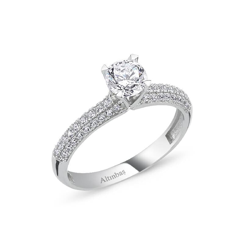 Immerse yourself in the rhythm of your heart with our Solitaire Gold Ring from Altınbaş Jewelry. This piece is a perfect embodiment of timeless beauty, a confluence of tradition and modernity. Crafted with meticulous attention to detail, this ring is designed to be a testament to your unique love story. The ring is made from 14K white gold, a metal known for its durability, making it a perfect choice for daily wear. Its gleaming white hue adds a modern touch to the traditional gold, creating a harmonious balance that reflects the essence of Altınbaş. At the heart of this ring is a stunning cubic zirconia solitaire, a gemstone that sparkles with an irresistible allure. This solitaire, set in a unique sidestone setting, serves as a radiant centerpiece, catching the light from every angle and reflecting your love in its dazzling brilliance. This ring is not just a piece of jewelry, it is an expression of timeless beauty. Its design is inspired by the rhythm of your heart, a rhythm that is as constant and enduring as the love it symbolizes. It is a ring that speaks volumes about your affection, making it the perfect choice for an engagement ring. The Solitaire Gold Ring is more than just an accessory. It's a symbol of love, a token of commitment, and a statement of style. Crafted for women who appreciate the finer things in life, this ring is a testament to Altınbaş's commitment to sophistication and quality. Experience the rhythm of your heart with this exquisite Solitaire Gold Ring from Altınbaş Jewelry. It's more than a ring, it's a celebration of love and a timeless expression of beauty.