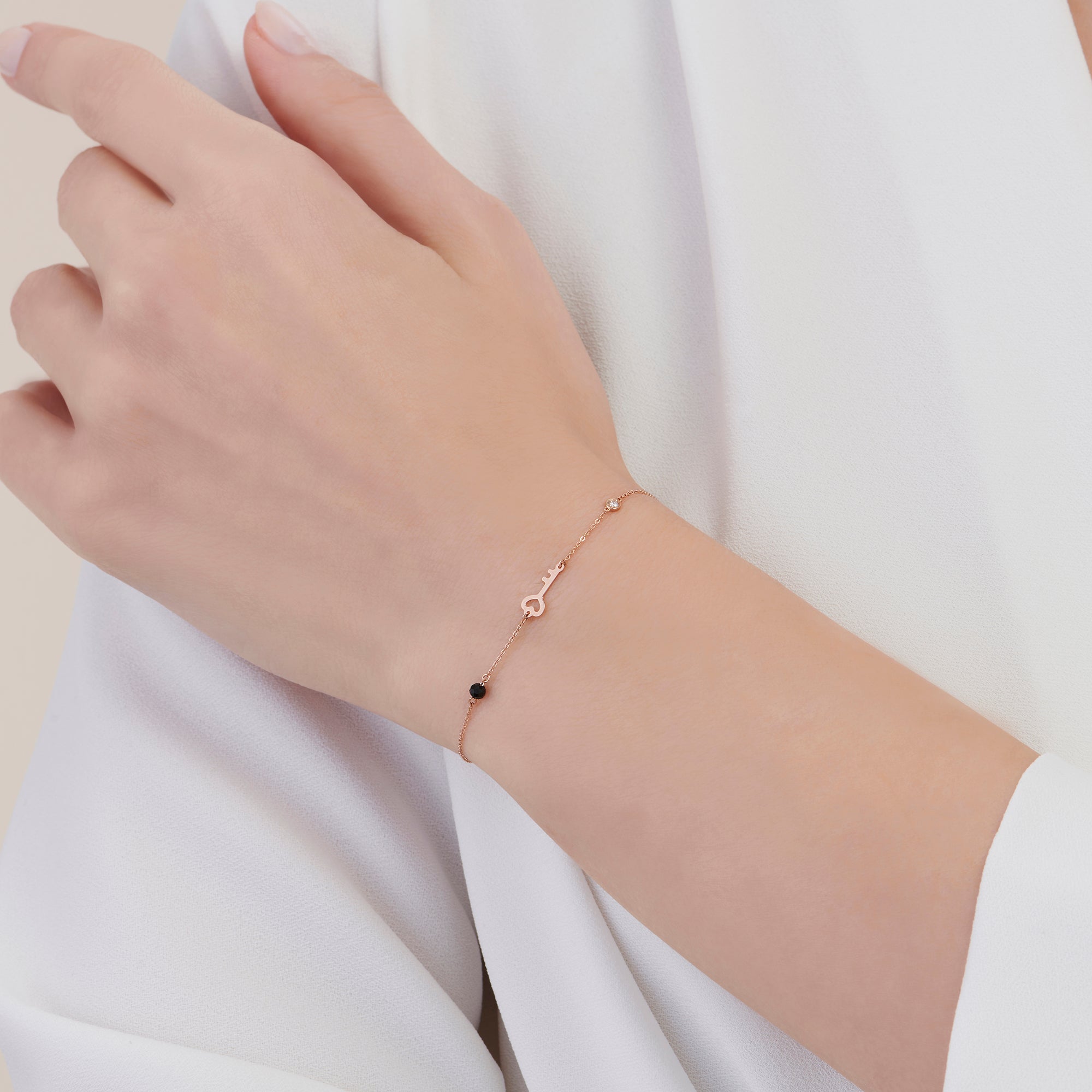 Presenting the Spinal Stone Diamond Key Bracelet from Altınbaş Jewelry, a testament to our unwavering commitment to sophistication and quality. This exquisite piece is crafted from 14K pink gold, a choice that radiates warmth and glow, instantly elevating any ensemble. The bracelet is a perfect blend of elegance and strength, showcasing our master craftsmanship. The bracelet's design features a round spinal stone, meticulously set to capture and reflect light in the most enchanting way. This stone is a symbol of relaxation and contentment, making it a perfect accessory to carry with you throughout your day, adding a touch of serenity to your look. The key element of this bracelet is its key charm, adorned with the finest diamonds. This key is not just a charm, but a symbol of unlocking new opportunities and opening doors to new beginnings. It's a piece that tells a story, making it much more than just a jewelry item. The bracelet forms an unending loop of elegance around your wrist, adding a touch of subtle sophistication to your style. It's a piece that speaks volumes about your refined taste and love for timeless elegance. The Spinal Stone Diamond Key Bracelet is more than just a piece of jewelry; it's a statement, an emotion, a story wrapped around your wrist. It's a piece that will make you stand out in a crowd and will leave a lasting impression. Experience the luxury and quality of Altınbaş Jewelry with this stunning bracelet. This is not just a purchase, but an investment in a piece that will stay with you for a lifetime, reminding you of the elegance and sophistication that you embody. Let this bracelet be a key to unlock your world of style and elegance. Embrace the warmth and glow of the pink gold, and let the diamonds and spinal stone bring relaxation and contentness to your life.
