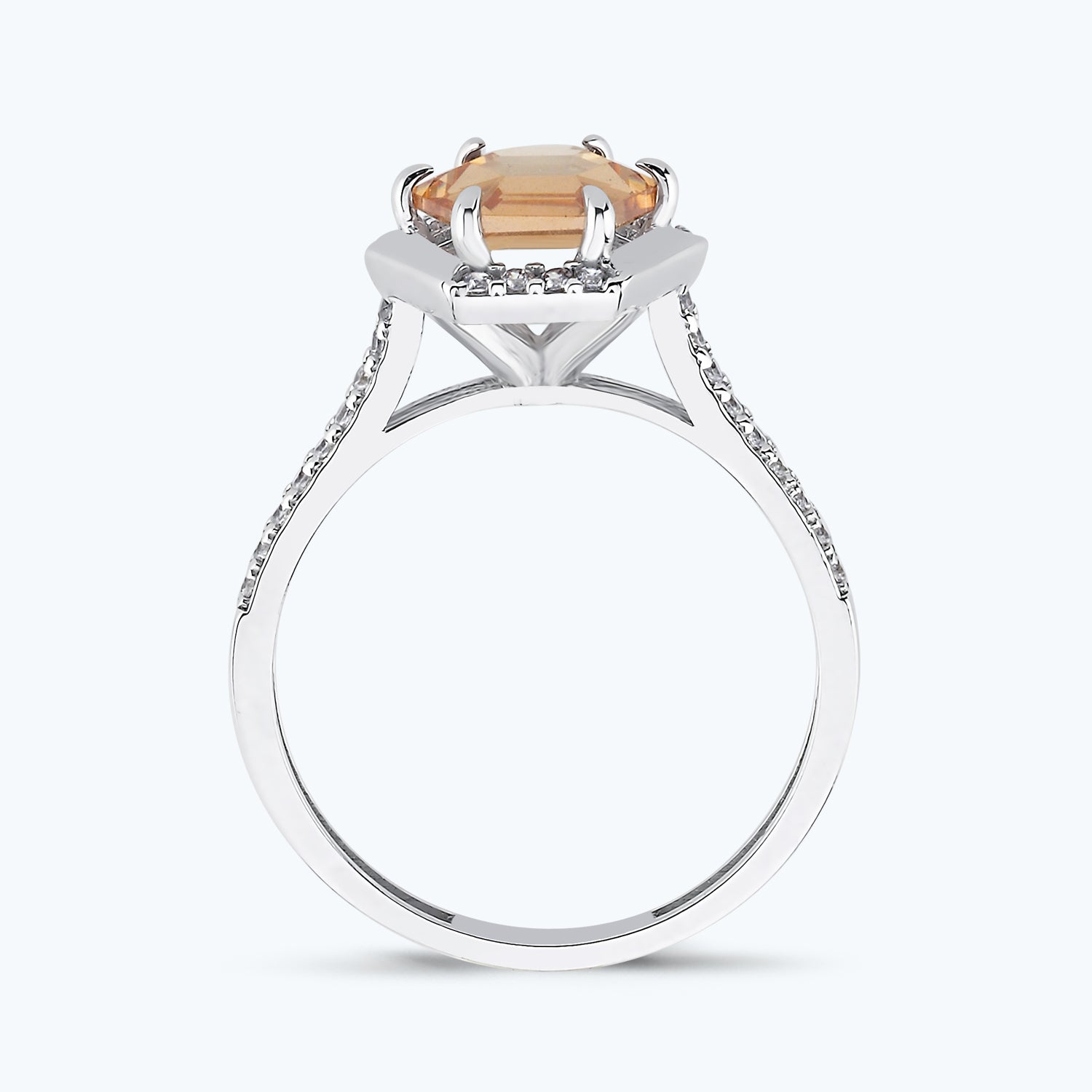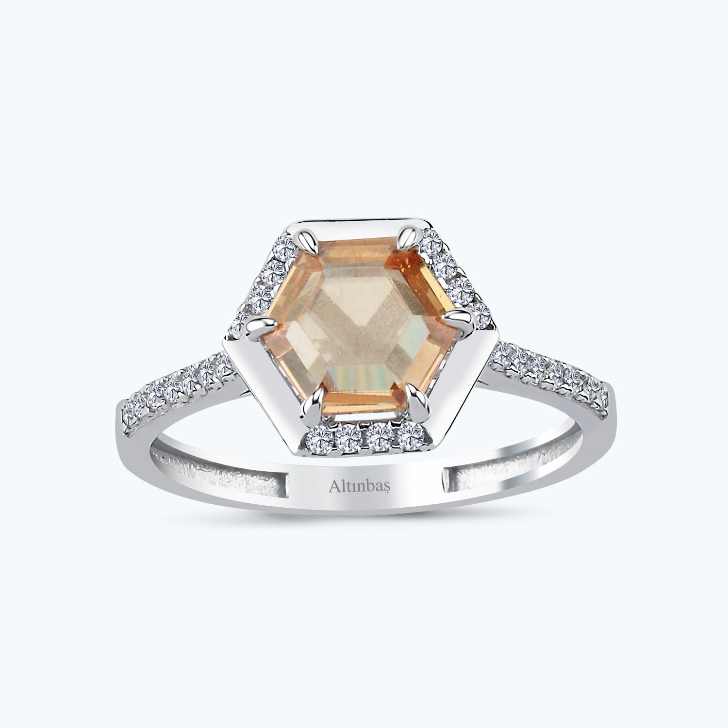 Introducing the Yellow Stone Gold Ring from Altınbaş Jewelry, a magnificent embodiment of sophistication and quality. This exquisite piece is crafted from 14K white gold, a testament to its purity and sanctity. The vibrant orange, hexagonal colored stone at the center is a reflection of your colorful spirit, adding a touch of elegance and charm to your ensemble. The ring features an array of cubic zirconia side stones, meticulously placed to enhance the brilliance of the central stone. These shimmering accents add a sparkle that is sure to catch the eye, reflecting light with every movement. This ring is not just a piece of jewelry, but a symbol that strengthens emotional bonds. It's the perfect choice for a woman with a stylish and vibrant personality, making it an ideal engagement ring. The radiant orange stone set in the gleaming white gold band is a beautiful representation of a love that's pure and everlasting. The Yellow Stone Gold Ring is more than just a piece of jewelry; it's a statement of style and sophistication. It's perfectly curated for the stylish woman, one who appreciates the finer things in life. This ring is a beautiful expression of love and commitment, a piece that will be cherished for years to come. At Altınbaş Jewelry, we believe in creating pieces that are not just beautiful, but also meaningful. Our Yellow Stone Gold Ring is a perfect example of this. It's not just a ring, it's a symbol of love, a reflection of your vibrant spirit, and a testament to your refined taste.
